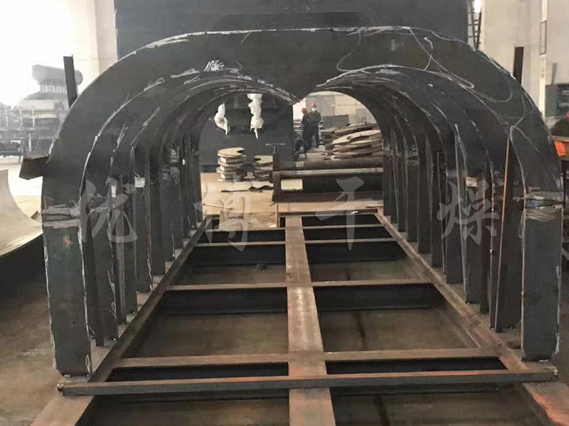設備采用傳導加熱方式,由相互嚙合的兩根葉片軸,帶有夾層W型殼體機座及傳動部分組成。污泥的整個干燥過程在封閉狀態下進行,有機揮發物異味氣體及其水份在密閉氛圍下通過引風裝置送至尾氣處理裝置,從而避免了對環境的污染。加熱介質一般選用蒸汽、導熱油。加熱介質分為兩路分別進入干燥機殼體夾層和槳葉內腔,將機腔和槳葉軸同時加熱,以傳導加熱的方式對污泥進行干化處理。 污泥進入機腔后,通過槳葉的轉動使污泥翻轉、攪拌,并不斷更新加熱界面,充分與加熱后的器身和槳葉接觸,從而使污泥的水份大量蒸發,同時污泥隨葉片軸的轉動向出料器輸送,然后干燥均勻的污泥由出料口排出。
